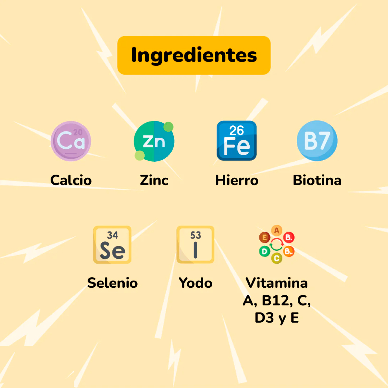 Formulado con una combinación poderosa de 10 vitaminas y minerales esenciales como las vitaminas A, B12, C, D3, E, Zinc, Hierro, Yodo, Selenio, Calcio y Biotina, este suplemento diario te brinda el impulso que tu cuerpo necesita sin complicaciones ni cápsulas difíciles de tragar. 💊🚫