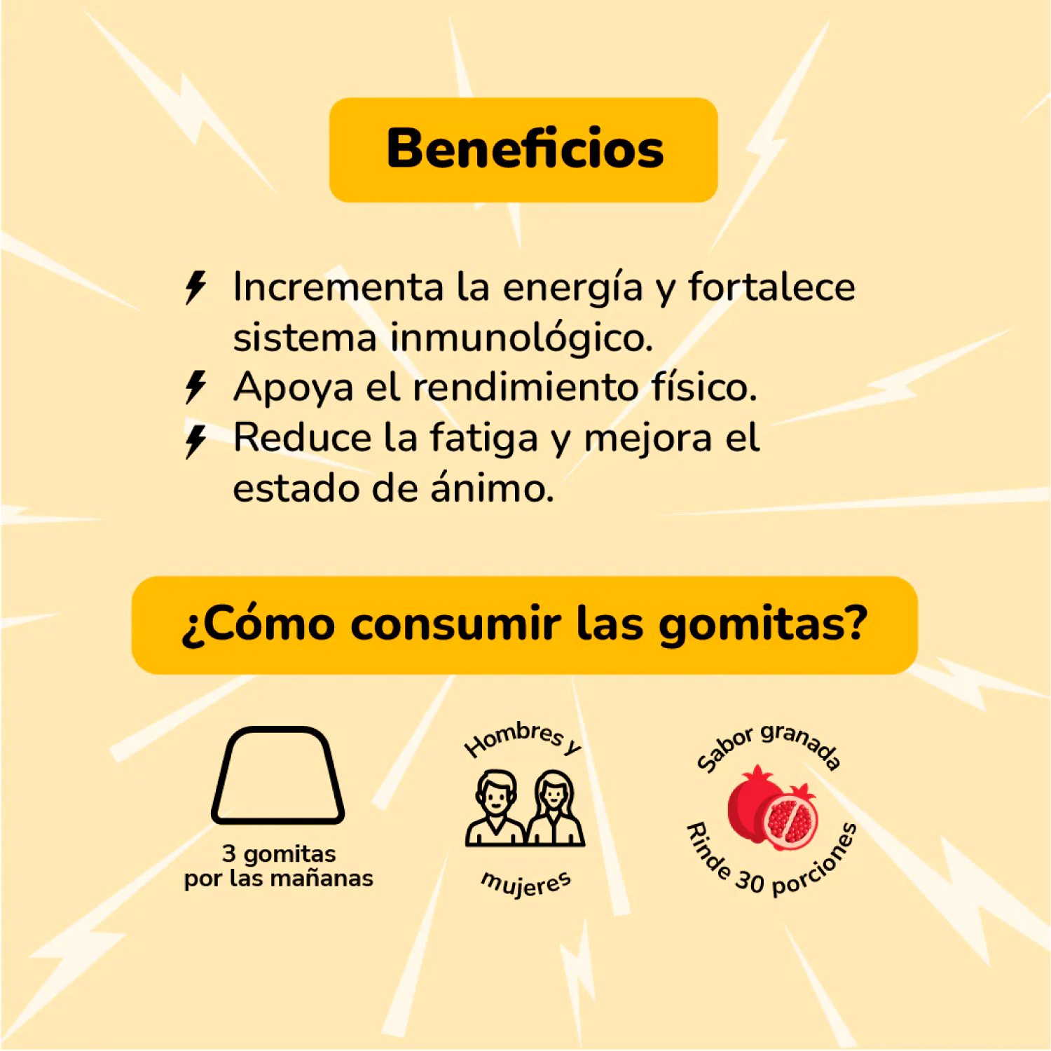 Se recomienda consumir 3 gomitas por la mañana para iniciar el día con toda la vitalidad. Cada frasco contiene 90 gomitas, es decir, tienes suministro para un mes completo. 📅